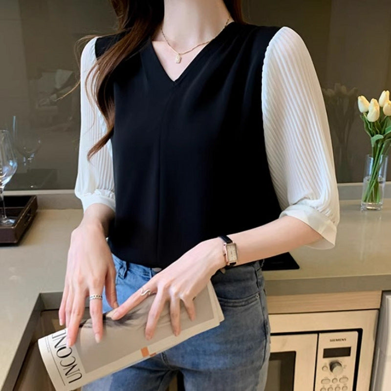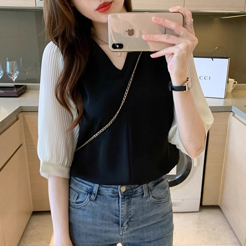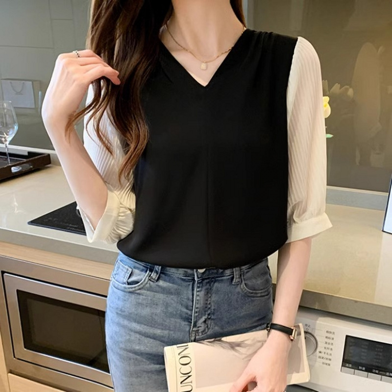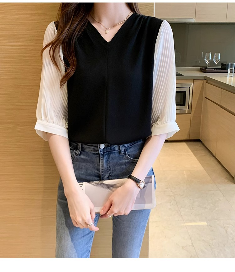 【骨格ストレート】バイカラーVネックスリーブブラウス
