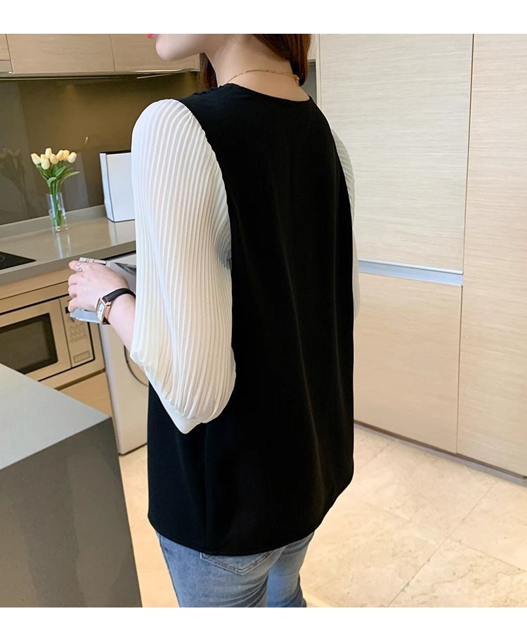 5分丈プリーツブラウスにVネックベストが組み合わさったようなバイカラートップス。袖が細いプリーツデザインがフェミニンな印象を与えます◎ベスト部分が細く、ベストと袖の色にコントラストがあるため縦ラインが強調され細く美しいスタイルアップしたボディライン魅せてくれるのがポイント!